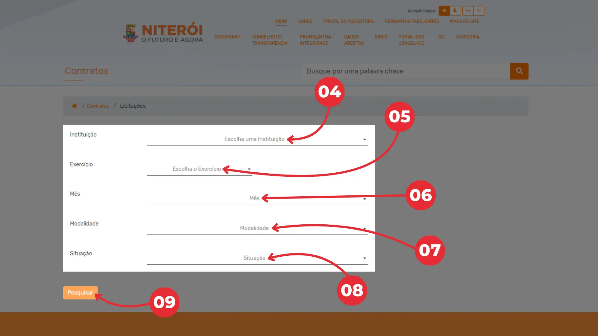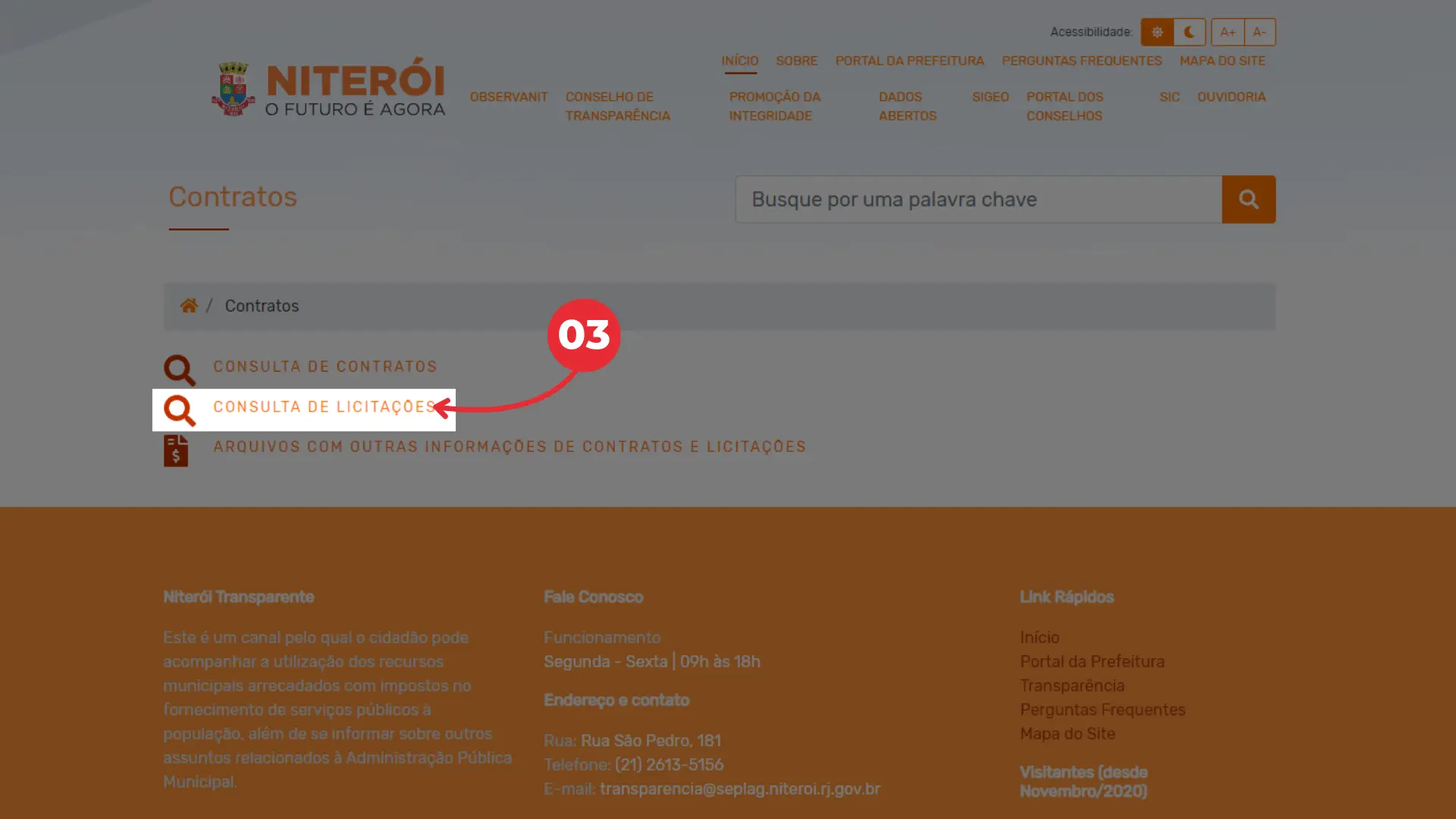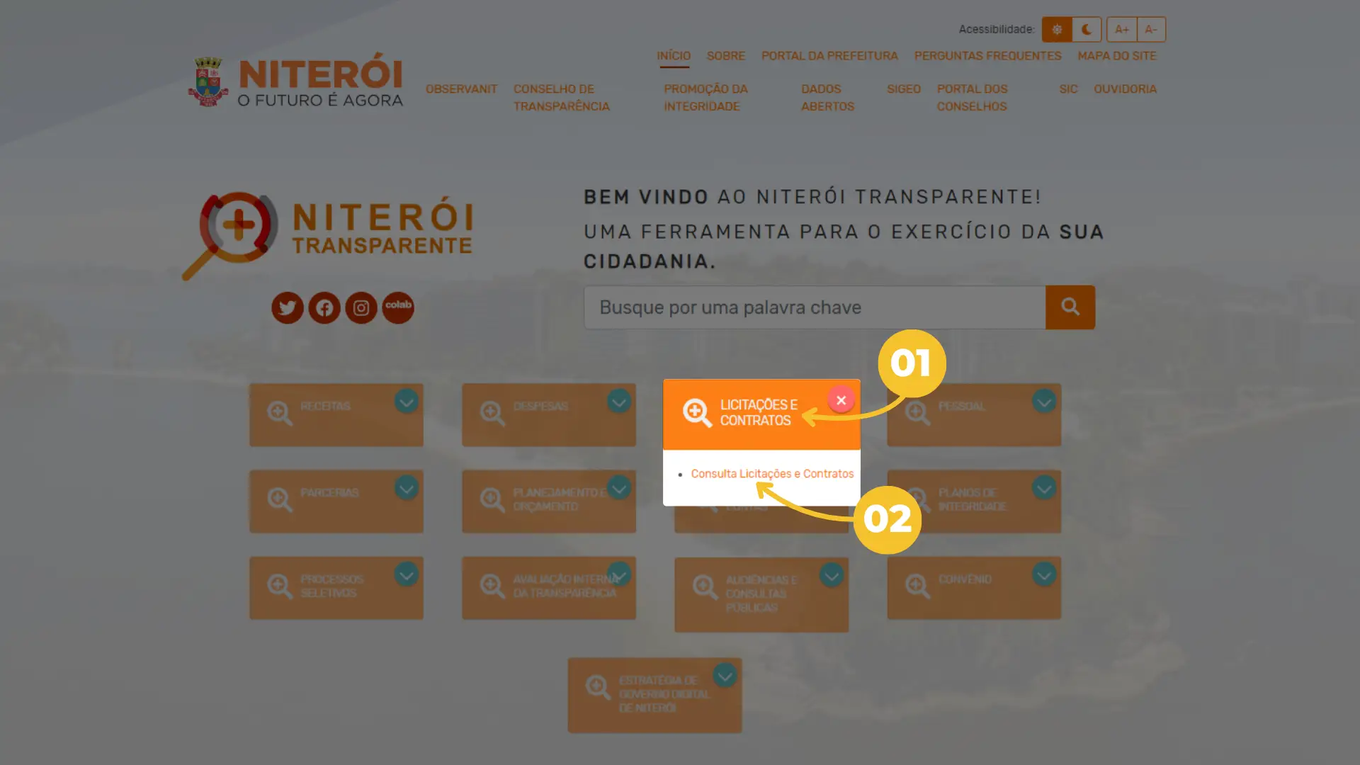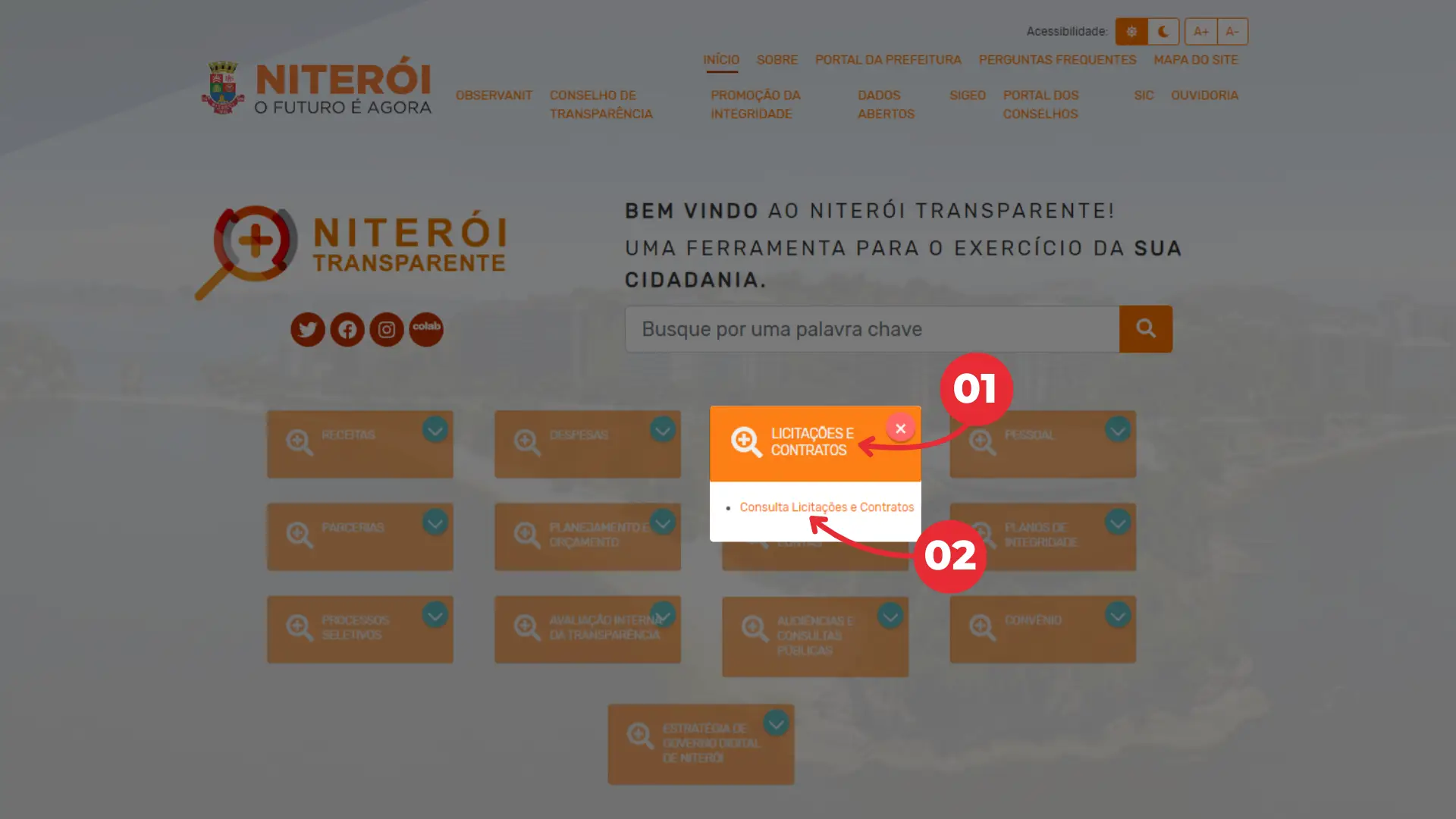 01 – Para realizar a consulta, clique na caixa “Licitações e Contratos”.