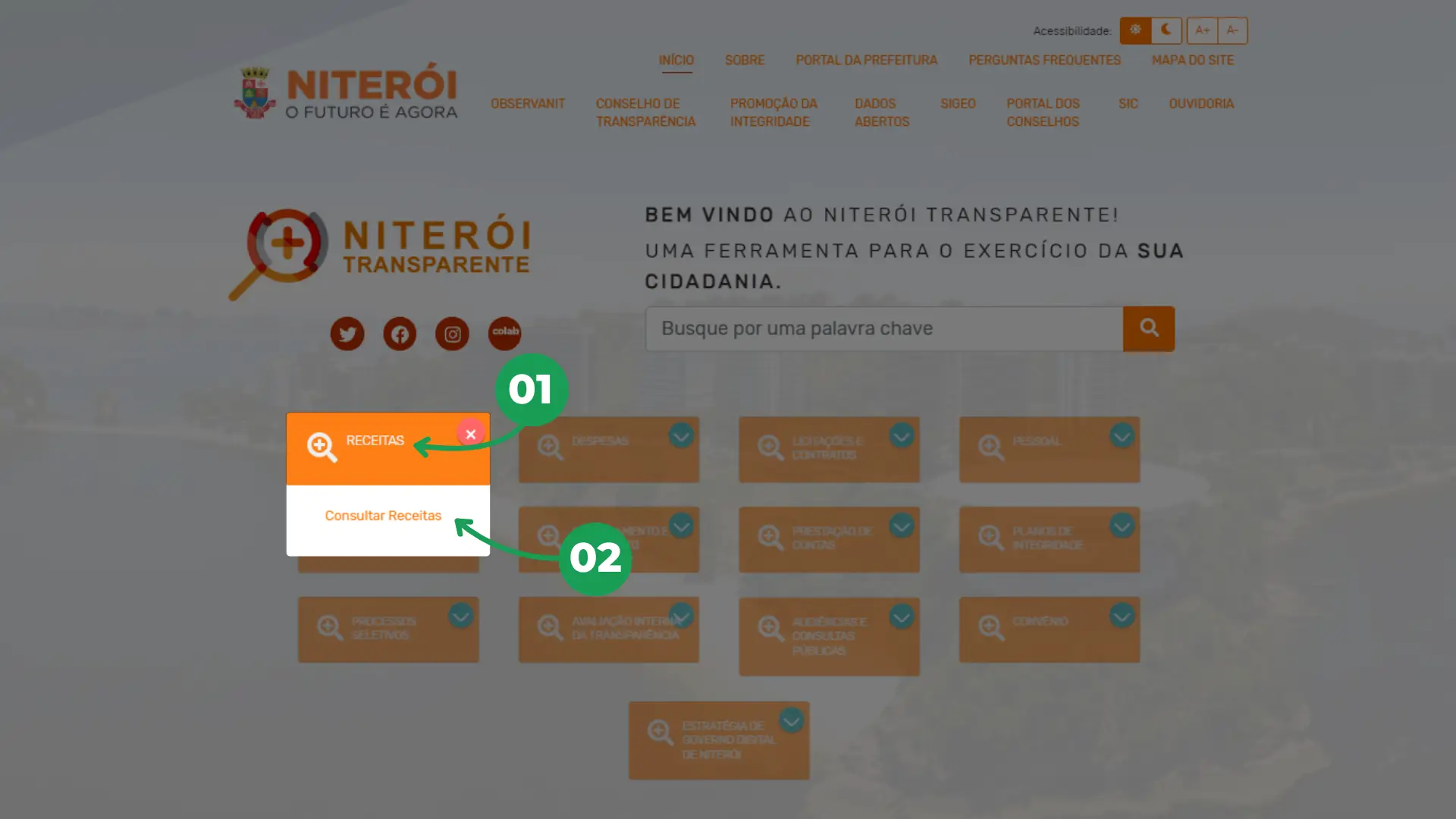 01 – Para realizar a consulta, clique na caixa “Receitas”.