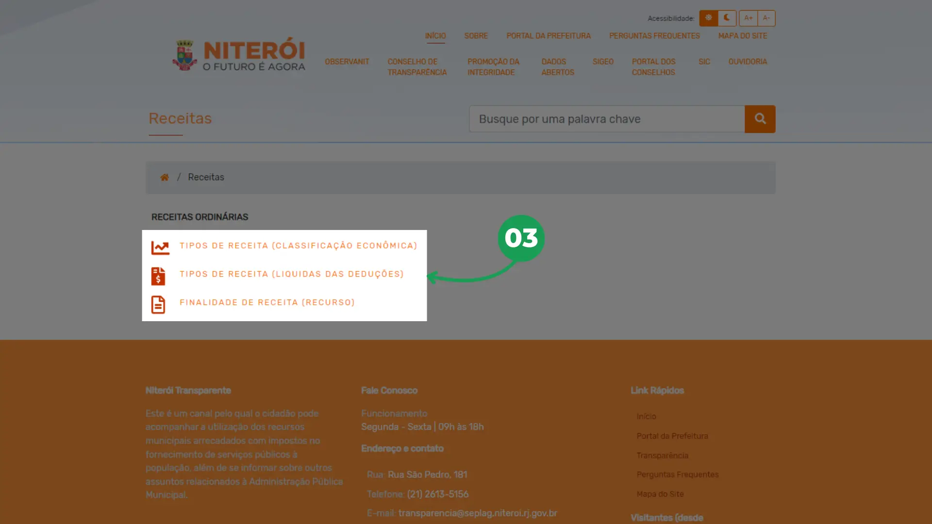 03 – No Portal da Transparência é possível fazer três tipos de consultas às receitas da Prefeitura de Niterói: por Tipos de Receita (Classificação Econômica), por Tipos de Receita (Liquidas das Deduções) e por Finalidade de Receita (Recurso). Selecione a opção desejada.