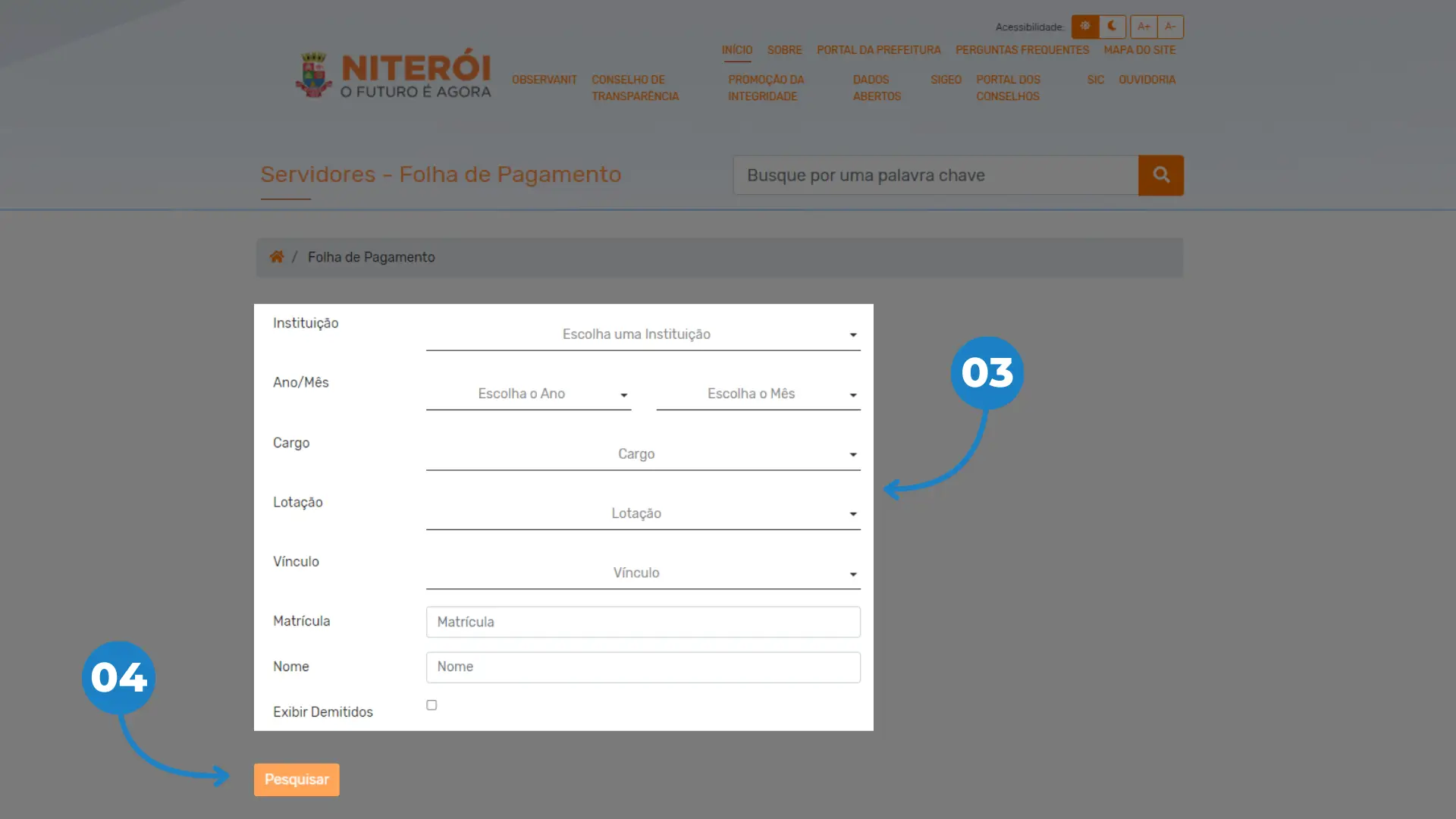 03 – Preencha os campos com as informações que você possui (número de matrícula; órgão ou entidade; ano e mês de referência; nome completo; lotação; cargo…)